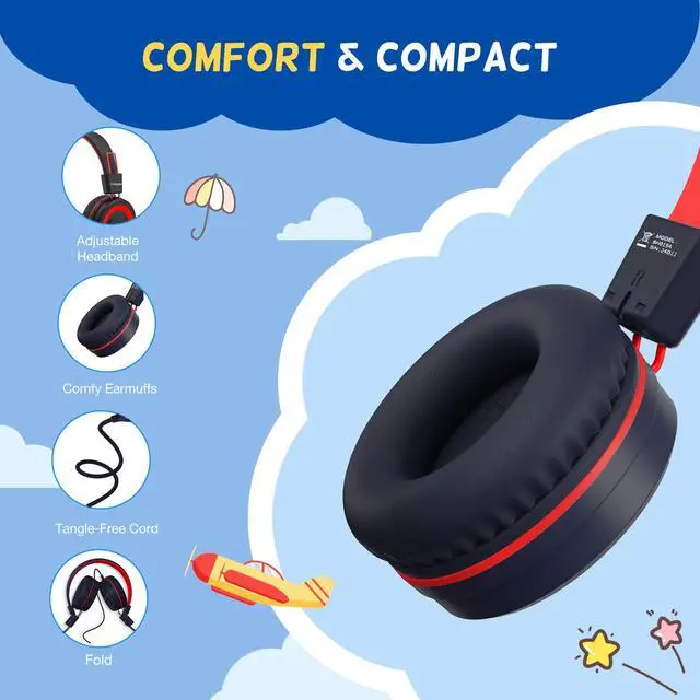 USB Type C Headphones for School, Wired Toddler Headphones, 94dB Volume Limited, HD Stereo Sound, Foldable Lightweight On-Ear Wired Headphones for Kids/Children/Teens/Boys (Red Black)