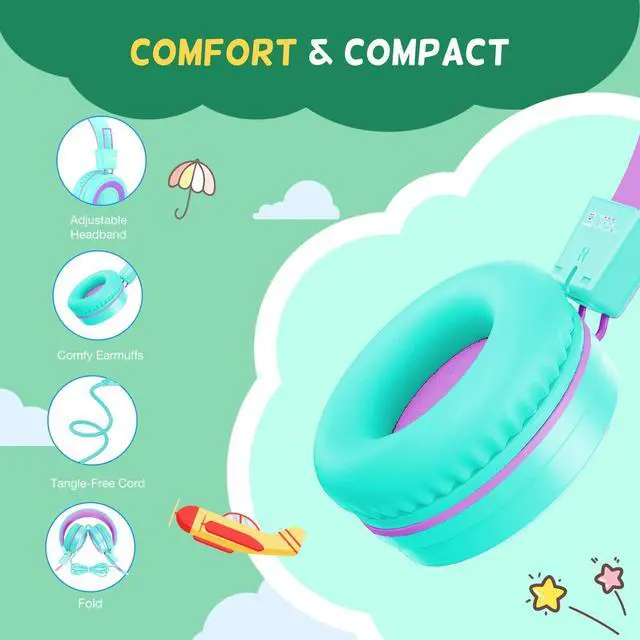 Wired Headphones for Boys and GirlsSuitable for children aged 3 to 12 years, these headphones feature skin-friendly ear cups made of protein leather and memory foam for a soft, comfortable fit. The design relieves pressure on the head and includes padded earpads and an adjustable cushioned headband for a secure fit.