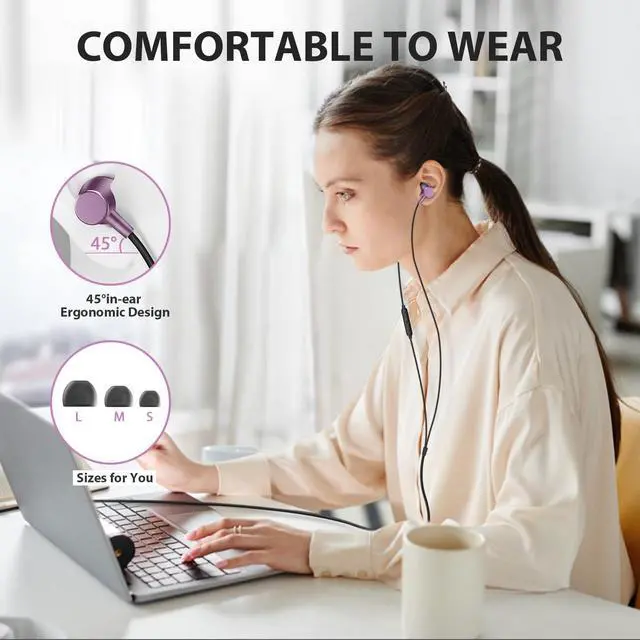 3 Size In-Ear Earbuds: Equipped with three sizes of soft silicone eartips (L/M/S) for a comfortable fit. The ergonomic semi in-ear design ensures no pressure on the ears, allowing for extended wear without discomfort. The 45-degree angle insertion helps keep them securely in place.