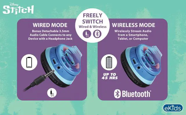 Wired Headphones Option: Use your headphones two different ways! Up to 45 hours of continuous Bluetooth playtime when connected to a device. Use the included 3.5mm audio cable to listen to music/audio when Bluetooth is not available, or when the battery needs to be charged.