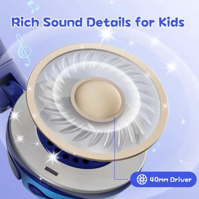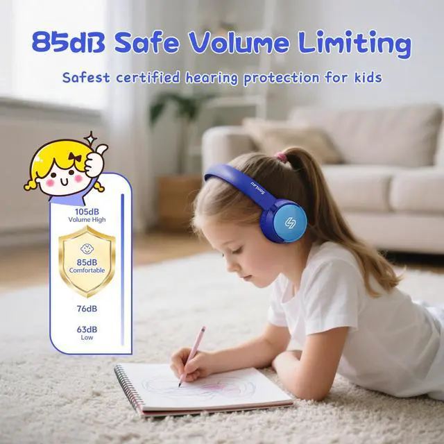 Premium Sound & Safety: These kids' bluetooth headphones deliver exceptional audio through 40mm speakers, immersing children in rich musical details. A volume limiter with one-touch toggle (85dB Child-Safe Mode / 94dB Supervised Mode) protects developing ears. The safety button is positioned to prevent accidental volume changes for worry-free listening.