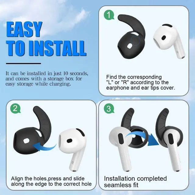 Package Included5 Pairs air pods 4 eartips cover (Black/White/Red/Pink/Blue), with a storage box, so that you can store your eartips cover after removing or replacing the eartips cover (The airpods and earpods NOT included).