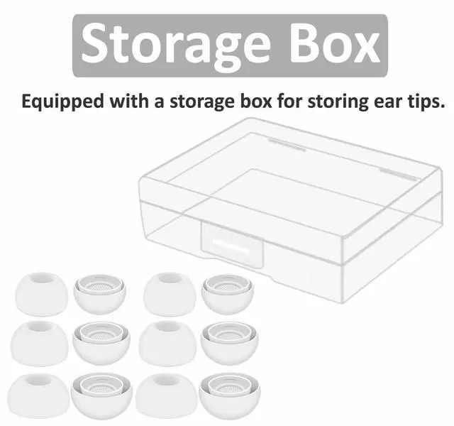 Storage Box Comes with a storage box to hold 6 pairs of ear tips, protecting unused ear tips from being lost or soiled. Ear tips only; earphones and charging case are NOT included.