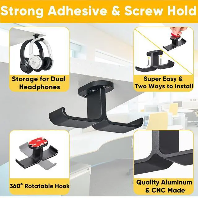 Desk Headphone Hanger with Strong Adhesive and Screws Mount, 360° Rotatable Dual Headset Holder Stand, Aluminum Metal Adjustable Headphone Hook, Perfect for Home Gaming & Office - Black