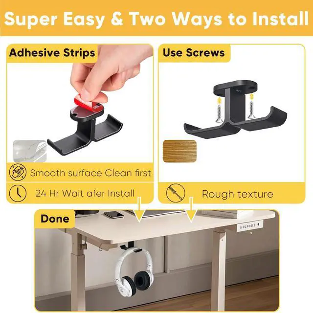 EASY INSTALLATION No tools required! Just peel and stick the headphone desk hook onto your desk or under-surface. This headphones hanger desk makes mounting your headphones simple and quick, with a secure hold thats perfect for any gaming headset mount.