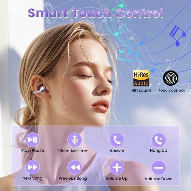 Smart Touch ControlEffortless Control at Your Fingertips - Equipped with sensitive touch control panels on the left and right earbuds, you can flexibly control music playback, answer or reject calls, adjust volume, or activate voice assistant. The wireless headphones use IPX7 nano-coating technology to seal the surface of both earbuds to prevent sweat or rain from penetrating.