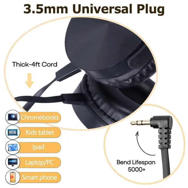 UNIVERSAL COMPATIBILITY: Wired headphones length 4 feet, includes 3.5mm plug for chromebook, laptop, pc, ipad, audiobooks and kids tablets. Perfect for use in schools, classrooms, libraries, and online classes.