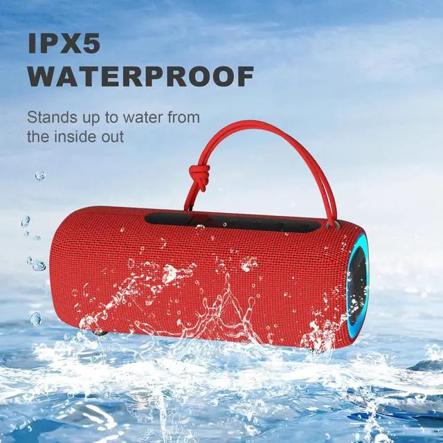 Waterproof and Rugged Design The waterproof Bluetooth speaker has an IPX5 waterproof rating to withstand rain, spills, and splashes. Its durable design can withstand bumps and drops, and it's compact and easy to carry. Perfect for pool parties, beach parties, barbecues, biking, hiking, camping, and more.