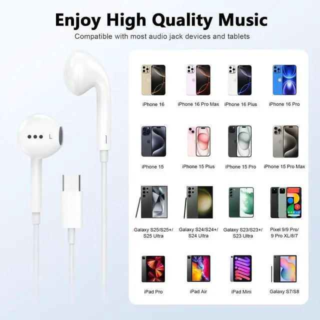 Wide Compatibility These USB C headphones are compatible with various devices, including iPhone models 15, 16, and 17 series, iPad Pro 12.9/11 inch, iPad Air 4/5th, iPad Mini 6, MacBook, Galaxy S series, Pixel series, and more USB-C devices.