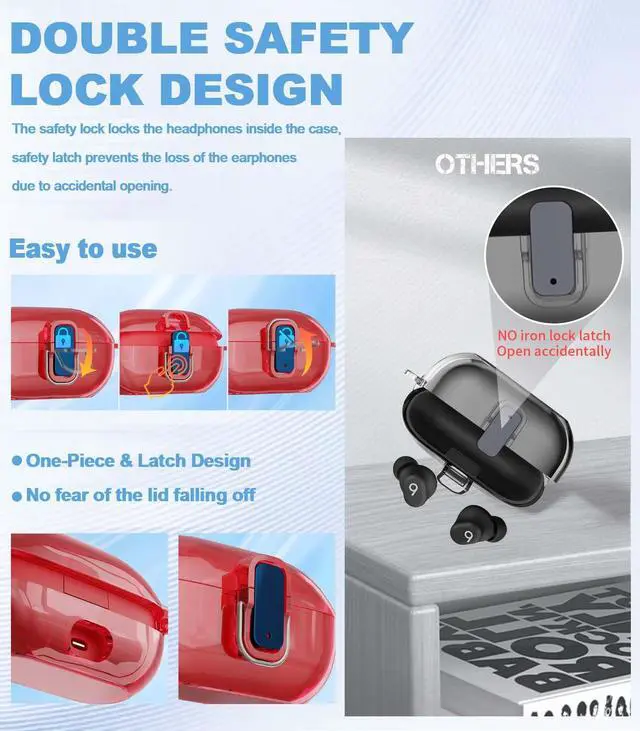 Double Safety Lock Design: The earphone shell features a one-piece design with a double safety lock on the front. Closing the iron lock latch gives you peace of mind, preventing the top of the case from accidentally falling off while youre out and about.