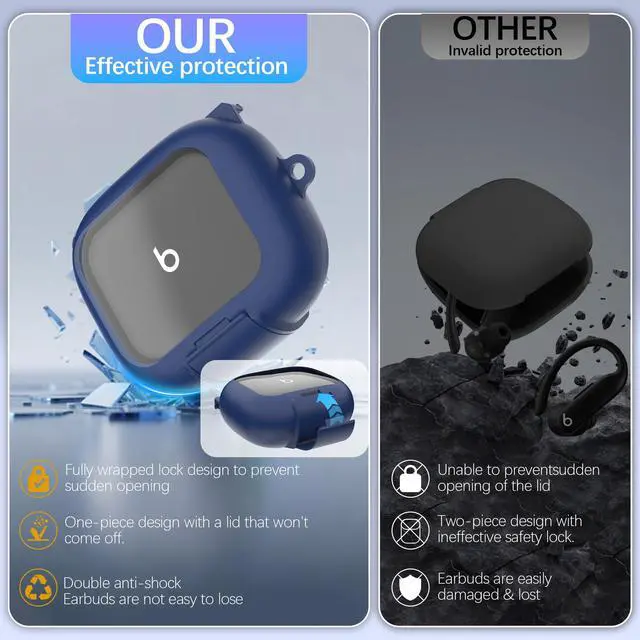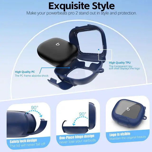 Double Lock Design One-piece design keeps the top always connected to the bottom. The front has a safety buckle and a safety lock; once locked, the cover can always remain closed. Even if it drops, you don't have to worry about the Powerbeats Pro 2 earbuds popping out and getting lost