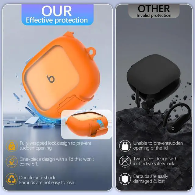 Double Lock Design One-piece design keeps the top always connected to the bottom. The front has a safety buckle and a safety lock; once locked, the cover can always remain closed. Even if it drops, you don't have to worry about the earbuds popping out and getting lost.