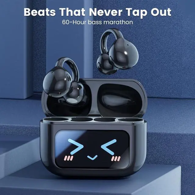 Clip-on Earbuds, Open Ear Earbuds with LCD Touchscreen Wireless Bluetooth 5.4, Lightweight Open Ear Headphones with C-Shaped Bridge, Slim Hook, 48H Battery, for Sports, Fitness (Black)