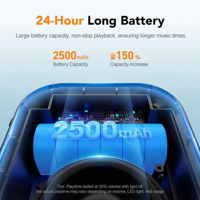 [Up to 24H Long-lasting Playtime] Built-in large battery that provides up to 24 hours of playtime at 30% volume with the light off. Whether at a holiday party or on an outdoor camping trip, it will make you enjoy non-stop music all day. Tips: The actual playtime may vary depending on volume and usage.