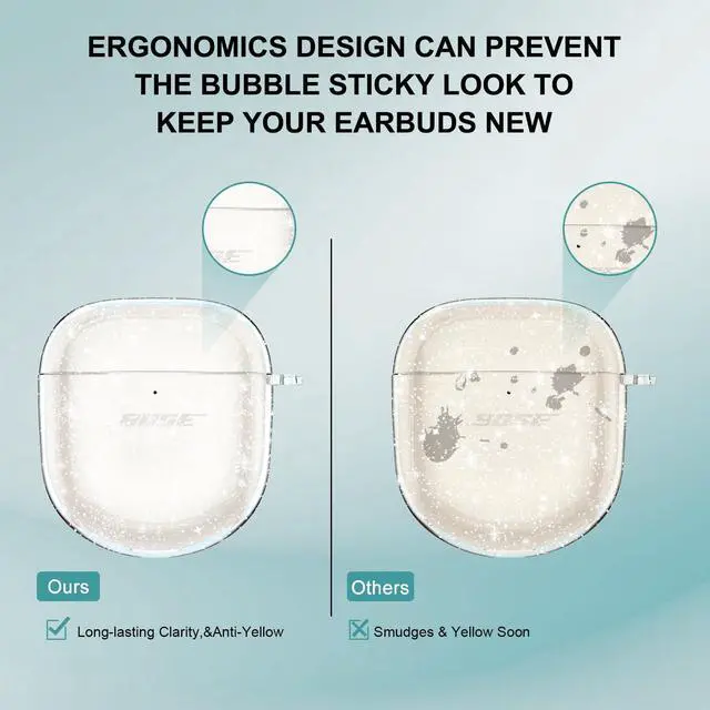 Beautiful Glitter & Lightweight - The case cover is made of professional eco-friendly anti-yellow premium TPU with embedded silver glitter, which keeps long-lasting clarity to showcase the original beauty of your earbuds while providing an extra shining look. The glitter will never flake off. The special interior micro dot pattern prevents a sticky wet look to keep your wireless earbuds pure and neat.