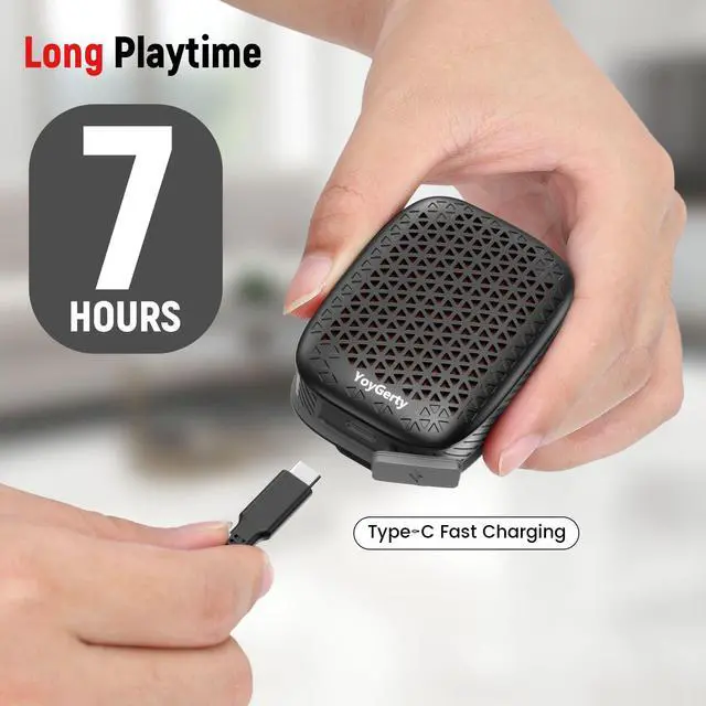 Long-Lasting Battery & IPX7 WaterproofThis clip-on speaker is equipped with a durable battery, providing up to 7 hours of continuous playback. Unlike traditional waterproof Bluetooth speakers, this one has an IPX7 waterproof rating, allowing you to use it with confidence even in rainy weather.