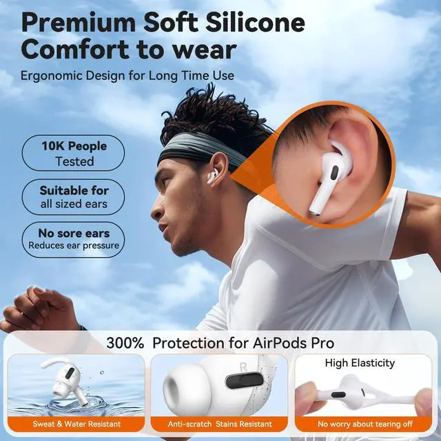 All-Day Comfort & ProtectionErgonomically crafted from highly elastic liquid silicone for pain-free wear. Tested across ear shapes for lasting comfort. Shields AirPods Pro from dust, scratches, and drops. Non-slip tips clean easily with water, and the high elasticity prevents tearing while you take them on and off.