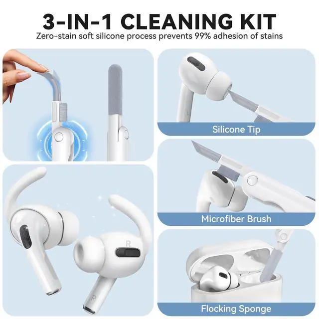 Included Cleaning Tool3-in-1 cleaning pen kit: includes a flocked sponge + high-density brush + silicone tip. Dual-ended hidden design saves space and is easy to carry. They're useful for removing dust from small corners, ensuring your earbuds stay clean.