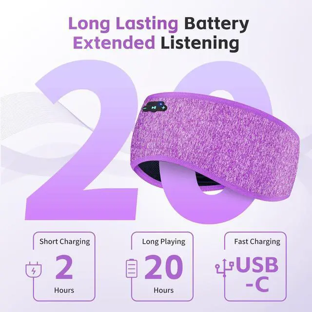 20 Hours of Uninterrupted SoundThe upgraded high-capacity rechargeable battery fully charges in just 1-2 hours, boasting 20 hours of non-stop playtime. Enjoy music, podcasts all nightno more midnight battery stress. Ultra-thin HD speakers, padded with soft silicone, eliminate ear pressure while delivering crisp, clear sound. With this sleeping headphones for side sleepers, sleep comfortably without bulky headphones pressing against your ear.