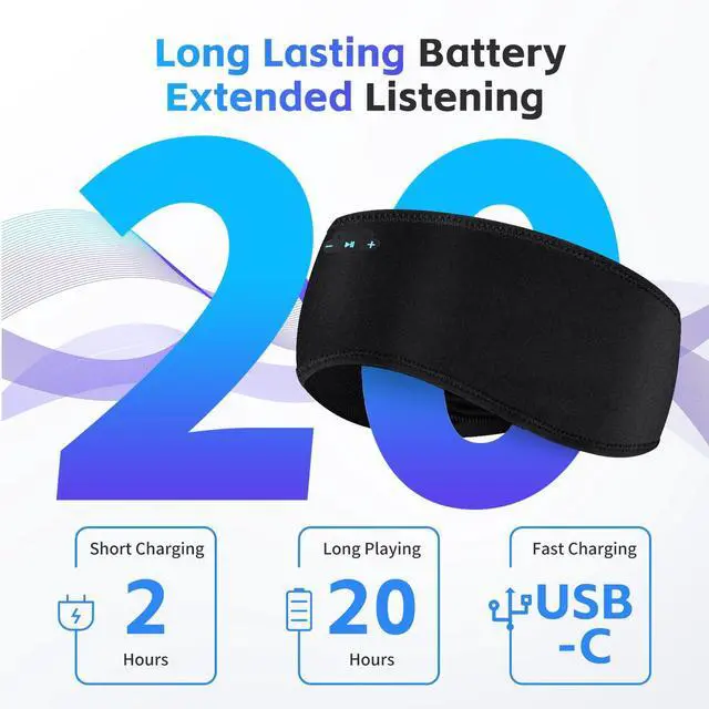 20 Hours of Uninterrupted SoundThe upgraded high-capacity rechargeable battery fully charges in just 1-2 hours, boasting 20 hours of non-stop playtime. Enjoy music and podcasts all nightno more midnight battery stress. Ultra-thin HD speakers, padded with soft silicone, eliminate ear pressure while delivering crisp, clear sound. With this sleeping headphones for side sleepers, sleep comfortably without bulky headphones pressing against your ear.
