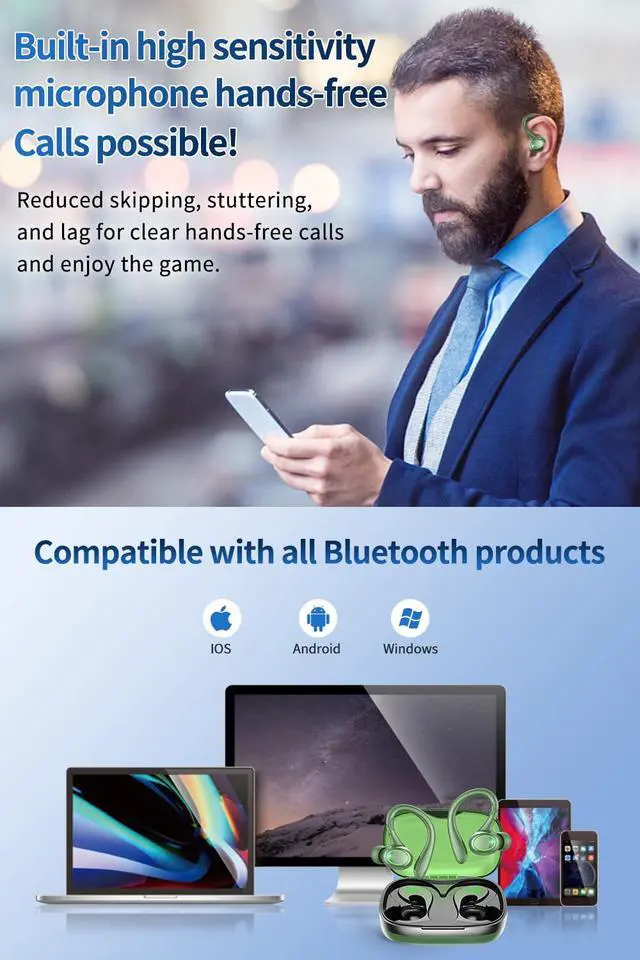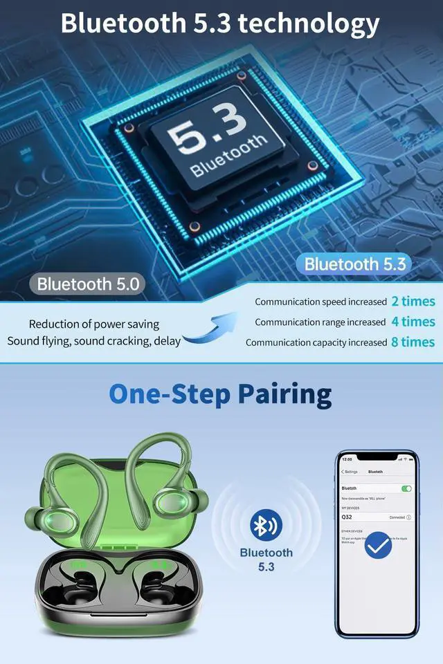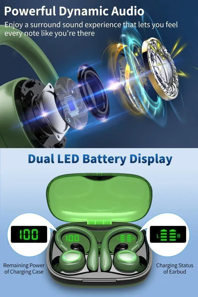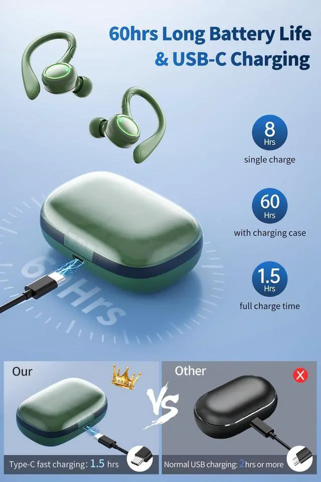 60 Hours Playtime & Stereo and Mono Mode: Enjoy an impressive 8 hours of listening time on a single charge, with a total of 60 hours of uninterrupted music playback. The headphones can seamlessly switch between stereo and mono mode, allowing both earbuds to work together or be used separately. A built-in dual LED power display clearly indicates the battery level of the case and headphones.