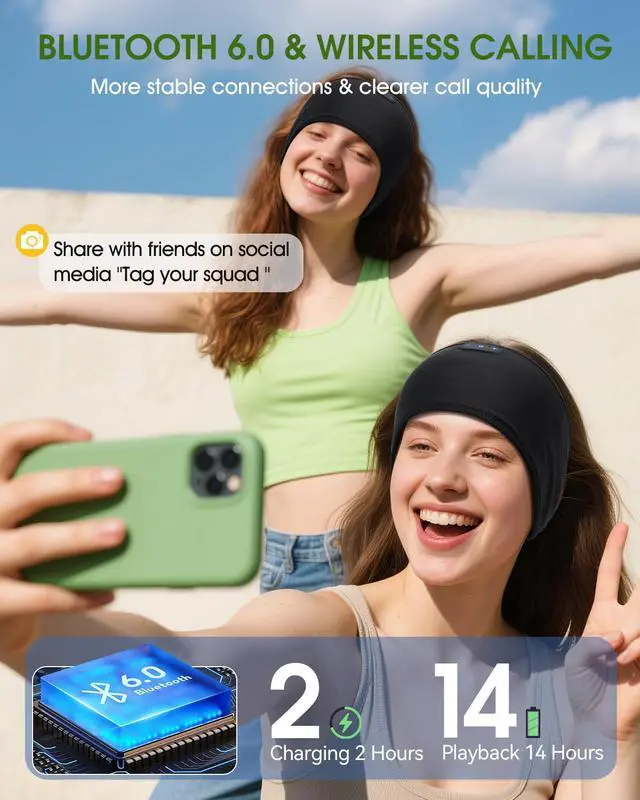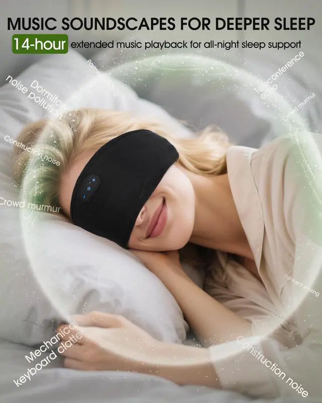 Hi-Fi Sleep Soundscape Ultra-thin Speakers This Bluetooth sleeping headband uses the latest Bluetooth 5.4 technology, which can achieve a more stable connection with your mobile phone, tablet, laptop, or desktop computer. Only 0.25-inch slim speakers bring high-fidelity stereo sound, and provide a soft and comfortable music environment.
