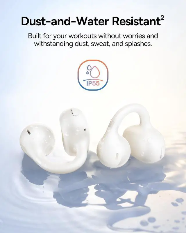 IP55 Water Resistant: Built to keep up with your active lifestyle, these open-ear clip-on earbuds are IP55 rated to resist dust, water, sweat, and splashes. Perfect for workouts, commutes, and everyday adventures without worries.
