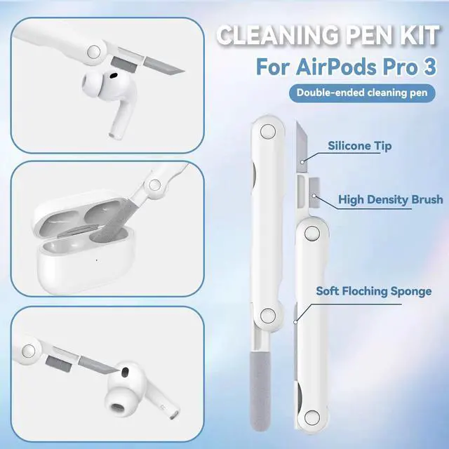 Multi-functional Cleaning Pen: Features a separate double-head hidden design. The soft flocking sponge can clean dust in the wireless charging case, while the metal pen tip effectively removes dirt from small parts and holes for deep cleaning. A high-density brush easily cleans dirt from the sound outlet and other areas, ensuring 360-degree cleaning without missing any spots.