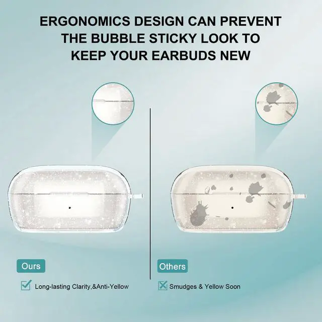 Elegant Glitter Design: The case cover is made of eco-friendly anti-yellow premium TPU with embedded silver glitter, keeping long-lasting clarity to showcase the original beauty of your earbuds case while adding an extra shining look. The glitter will not flake off, and the special interior micro dot pattern keeps your earbuds looking clean and neat.