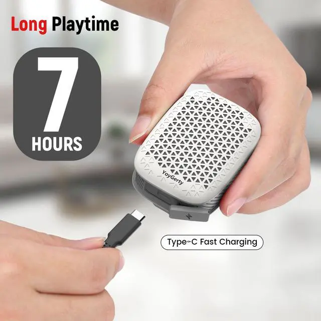 Long-Lasting Battery & IPX7 WaterproofThis clip-on speaker is equipped with a durable battery, providing up to 7 hours of continuous playback. Unlike traditional waterproof Bluetooth speakers, this Bluetooth speaker has an IPX7 waterproof rating, allowing you to use it with confidence even in rainy weather.