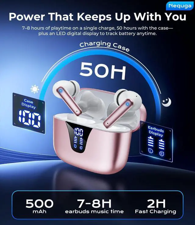 50-Hours Power Marathon & LED Power Tracker: The built-in LED display shows exact remaining power (0-100%), while the 500mAh portable charging case delivers a whopping 50 hours of total playtime by alternating between wireless earbuds. Built tough with 500+ charge cycles, these earbuds are future-proof.