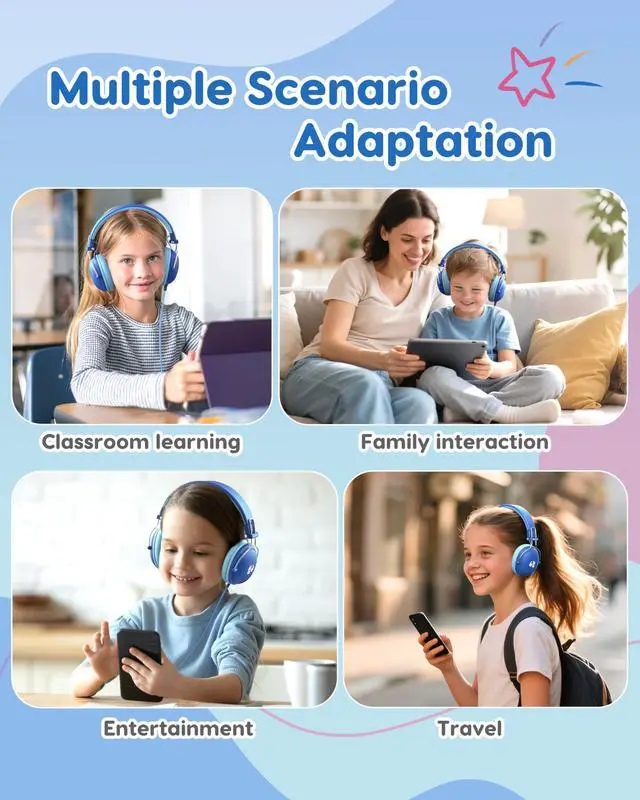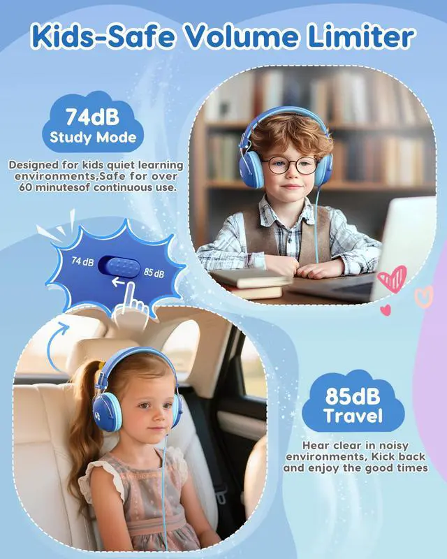 Safe Volume & Kid-Friendly Materials: The kids headphones feature a 74/85 dBA adjustment button on the earcup for easy parental monitoring, preventing potential hearing damage. They are made of child-safe and eco-friendly materials.