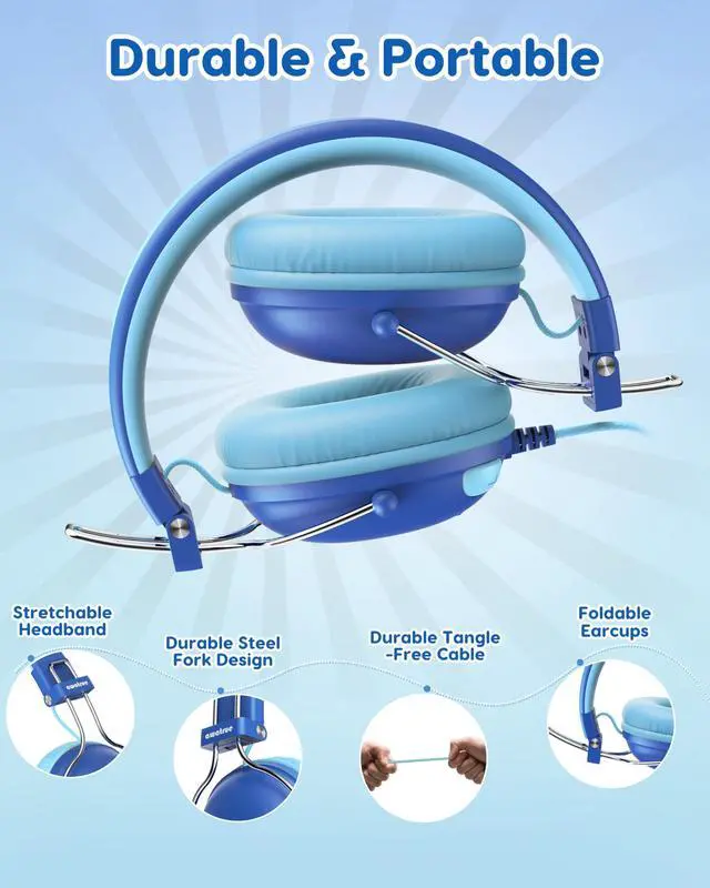 Super Durable & Foldable: These kids headphones come with tangle-free cables and reinforced headband hinges that can withstand the rigors of backpacks, playgrounds, and turbulence. They are foldable and compact, convenient for carrying and storage.