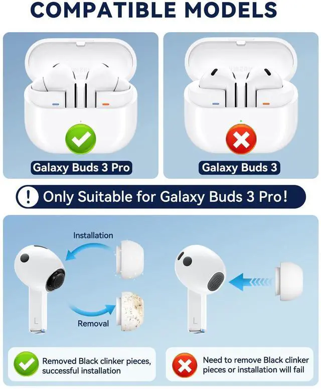 Compatible: Tips are exclusively designed for Galaxy Buds 3 Pro (2024) / Galaxy Buds 3 PE (2025). Package includes three sizes, S/M/L, ensuring that even the largest size earbuds can be placed in the charging case without issue.