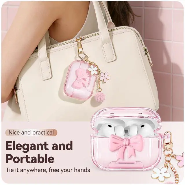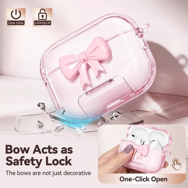 Bow Safety Lock Design: The bow is not merely decorative; it functions as a safety lock device. When the headphones are closed, press the bow once to unlock the safety lock, allowing the top cover to be opened. It keeps the AirPods Pro 3 charging case securely closed, preventing accidental opening when carrying or dropping.