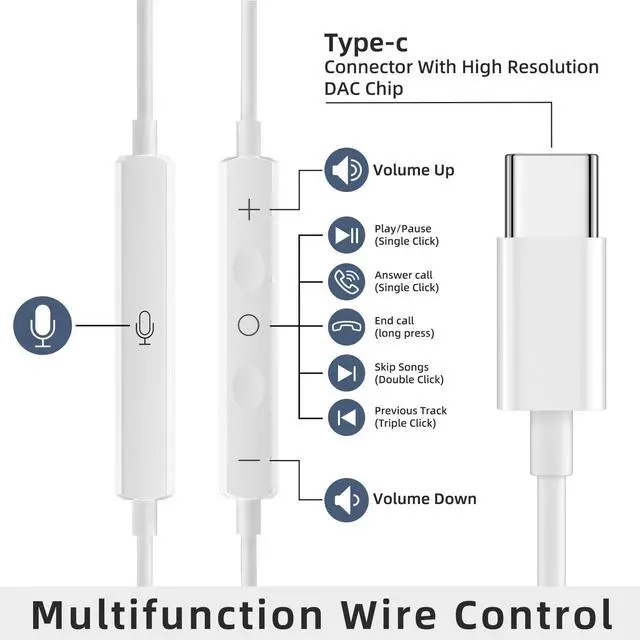 USB C headphones compatible with a wide range of devices including iPhone models and various USB C devices. These headphones support Volume+/-, Last/Next Track, Pause, Answer/End/Reject Call, allowing you to free your hands while enjoying music or taking calls during activities like driving, walking, exercising, or shopping.