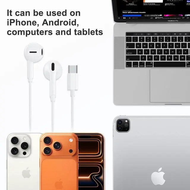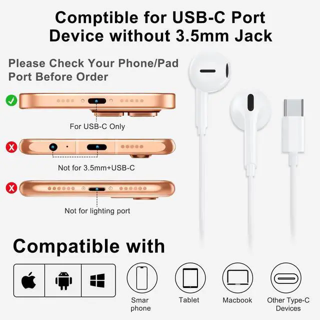 USB C Headphones compatible with various devices, including iPads and MacBook models, Google Pixel smartphones, and Samsung Galaxy devices.