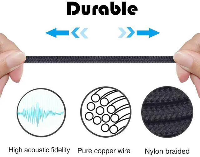 Jack: 3.5mm male to 3.5mm. Cable diameter: 3mm. Color: Gray. Length: 4.3ft/1.3m. Cable material: The inside cable is OFC wire, and the outside cable is Tangle-Free Nylon Braided cord.