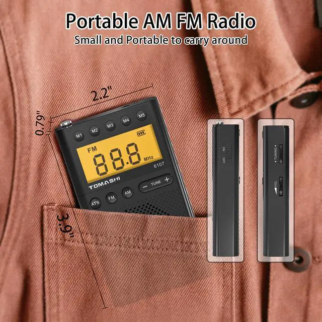 Pocket Radio: FM band from 64/87 to 108 MHz and AM band from 520/522 to 1710 KHz; 1.96 x 0.86 x 3.66 inches; 2.78oz; This radio is compact and lightweight, making it perfect for jogging.