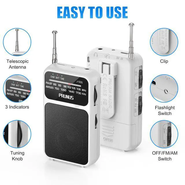 Easy to Use The AM/FM switch of the handheld radio allows you to effortlessly switch between channels, while the intuitive rotary tuning and volume knobs provide smooth control. The tuning indicator light makes it easy for both seniors and children to find and enjoy their favorite stations. Additionally, the built-in flashlight offers peace of mind in the dark.