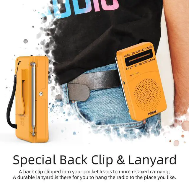 Portable DesignYou can hold this mini radio with one hand. It's small enough to fit into an emergency kit. This FM AM radio measures 4 x 1.7 x 1 inches and weighs only 4.2oz (without batteries). Thanks to its back clip and lanyard, this transistor radio is easy to carry around whether its clipped to your pocket or carried with a lanyard. Take it for morning exercise, a stroll, or a break in the park, along with some brisk music or an engaging radio show.