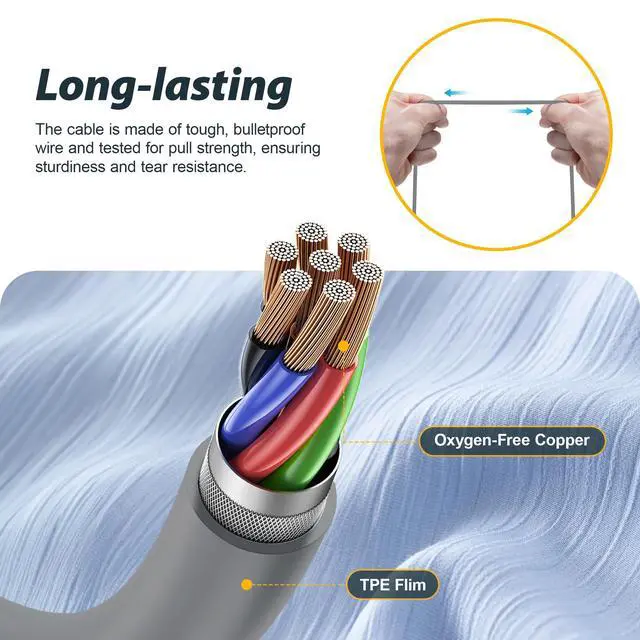 Long-lasting: The cable is made of tough, bulletproof wire and tested for pull strength, ensuring sturdiness and tear resistance.