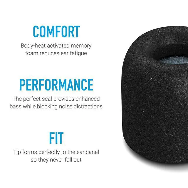 Advanced Sound & Fit: Body-heat activated memory foam adapts to ear canal to provide a perfect seal and snug fit to keep your earbuds in place while blocking external sound.