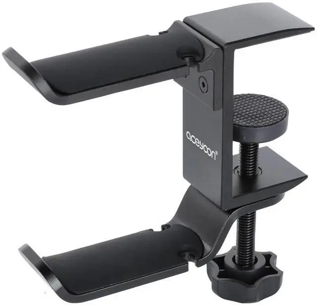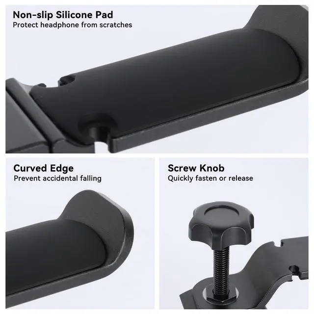 Sturdy & DurableThe headphone holder is made of solid aluminum alloy and can support up to 11lb/5kg. Simultaneously hang 2 headphones without bending or breaking. The adjustable screw knob is easy to install, disassemble or move, no drilling or glue required, keeping your desktop clean and tidy.