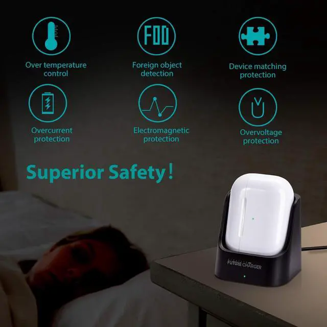 Intelligent Protection Technology - The wireless charger features Multifunctional Intelligent Protect Technology providing temperature control, over-voltage and over-current protection, short-circuit prevention, and Foreign Object Detection. Using this professional wireless charger enhances the longevity of your Airpods.