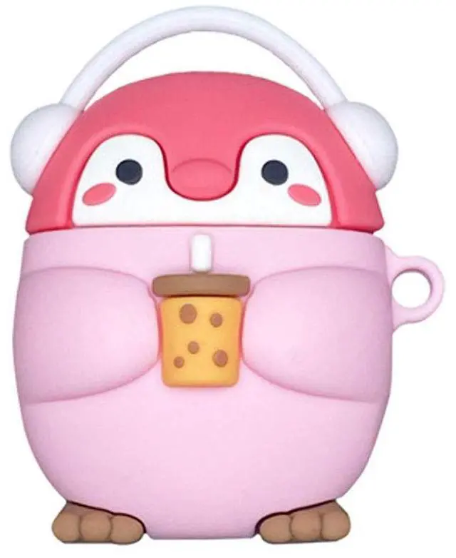 Earphone Case Compatible with AirPods Pro, Super Cute Standing Headphone Penguin Baby with Milk Tea in Hand Case, Stylish Kawaii Soft Silicone Earbud Protection Skin -Pink