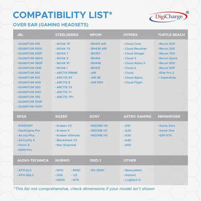 Digicharge compatible for various headphones and gaming headsets.