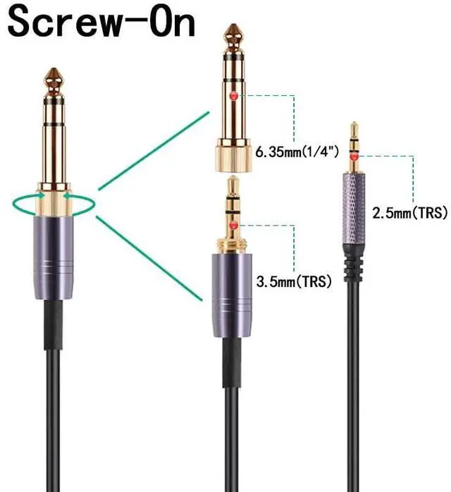 2.5mm 3 poles (TRS) male plug to 3.5mm (1/8") 3 poles (TRS) male jack with 6.35mm (1/4") screw-on adapter. Gold-plated tips ensure high-quality stereo sound and support 7.1 surround atmosphere with minimal noise.