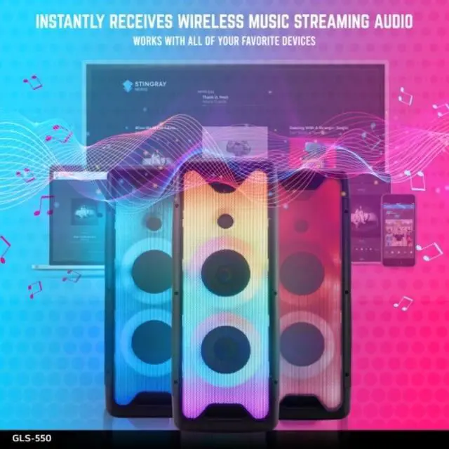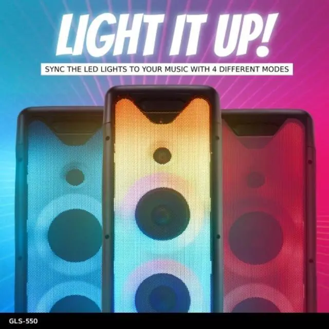 The GLS-550 includes a Mic/Guitar input with EQ Controls. Pairs to a 2nd GLS Series Speaker via TWS connection to create the ultimate lit up surround sound audio experience to flare up the house, room or your speaker. Wireless Bluetooth and Rechargeable Connect and play your beats whether you are a DJ at a small party or at home via Bluetooth and connect to the Bluetooth tower speaker from up to 30 feet away. Multi-color LED Light Show Turn the lights out and let the music control the mood with a full front facing light show that changes and can be adjusted to the beat of your music.