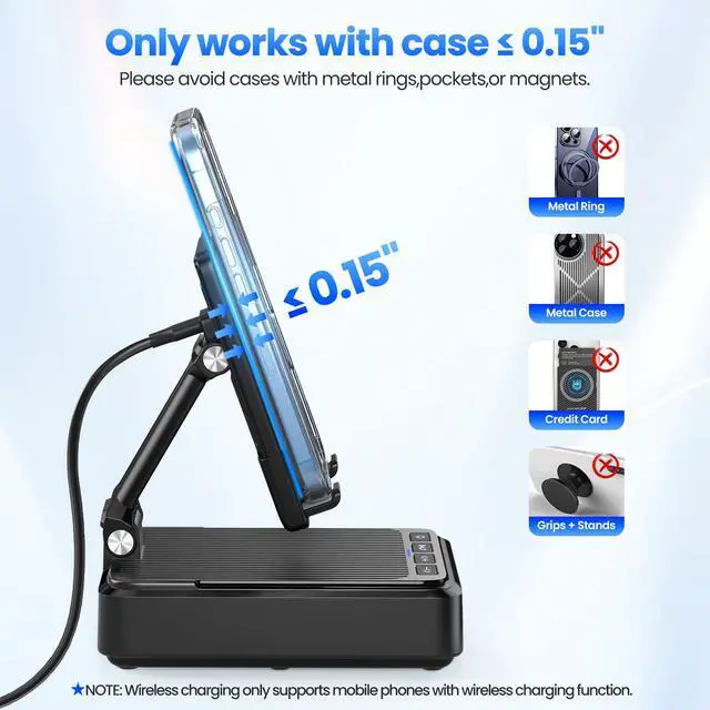 It supports 7.5W charging for iPhone 8 to 16 series. It also supports 10W charging for the S22/S22 Ultra/S21/S20/Note 10/S10/S10E, and 5W charging for any device that supports wireless charging.